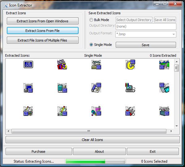 Extract Icons From All Files, Including Executables, or From Open Windows. Save one-by-one or in Bulk Mode, Supporting *.bmp, *.jpg, and *.ico.